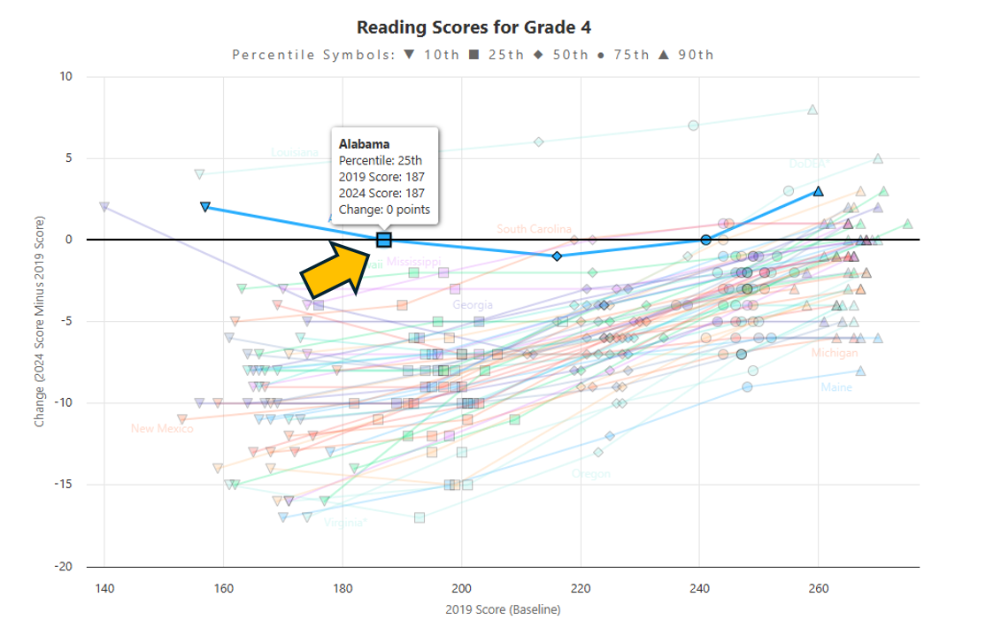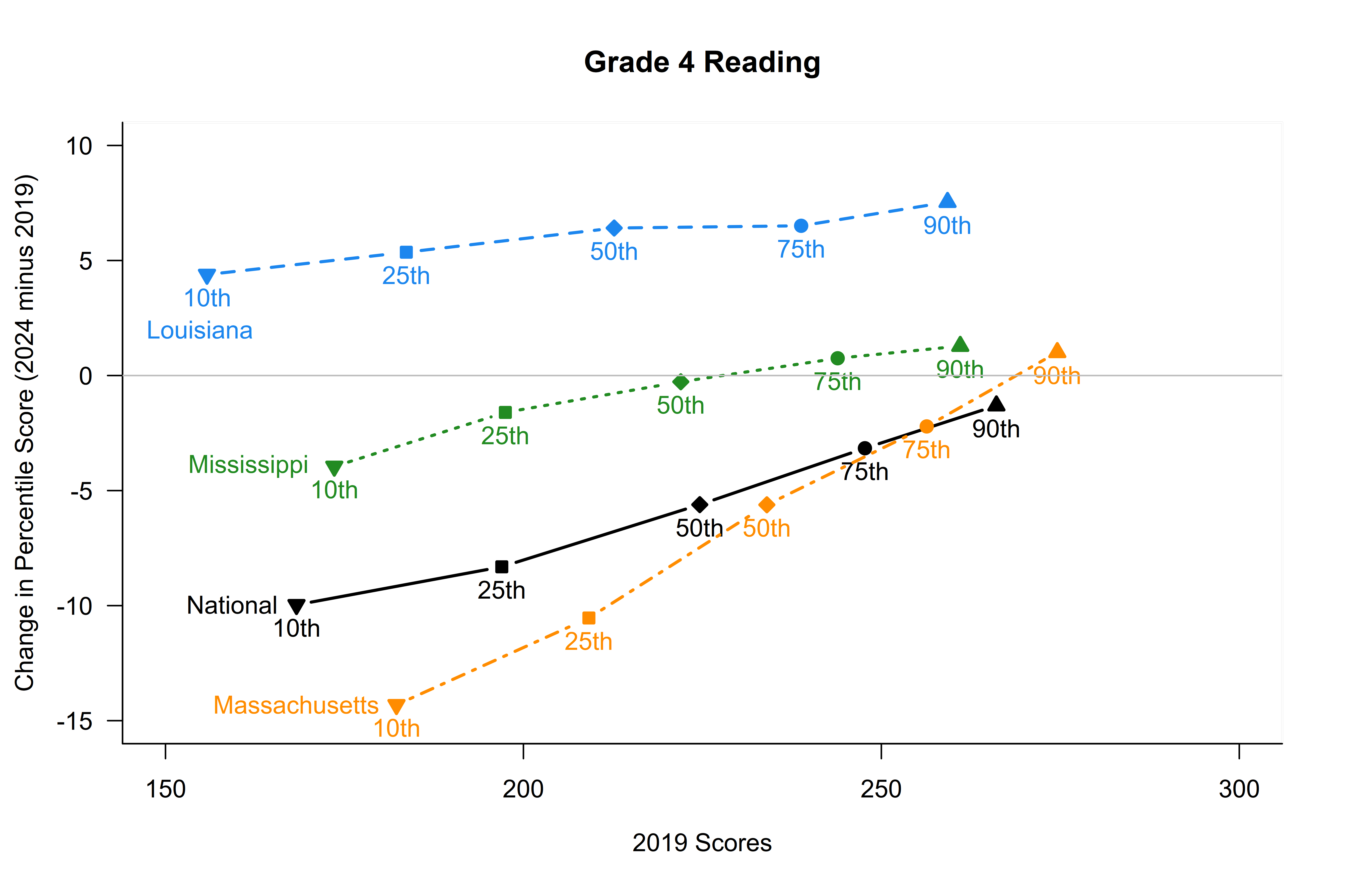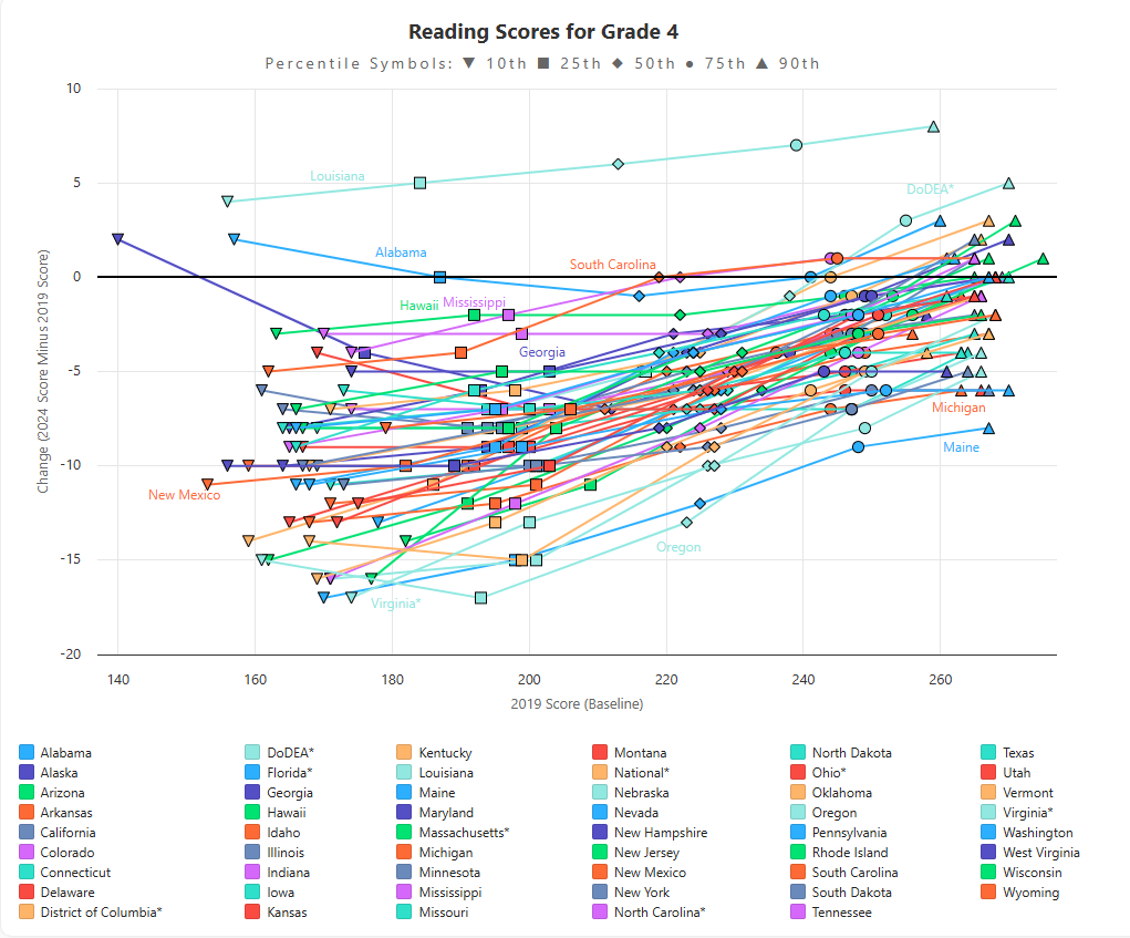 - However, the lines for Louisiana and Mississippi are much shallower or less steep, meaning that educational gains and losses were more similar between high and low performers. The line for Louisiana is above 0 and almost flat! This means that Louisiana was able to rebound scores to or beyond pre-pandemic levels for students across the achievement spectrum. Grade 4 students, regardless of academic need or level, are performing better in Louisiana in reading in 2024 than pre-pandemic in 2019! This result may reflect Louisiana’s reforms at work.