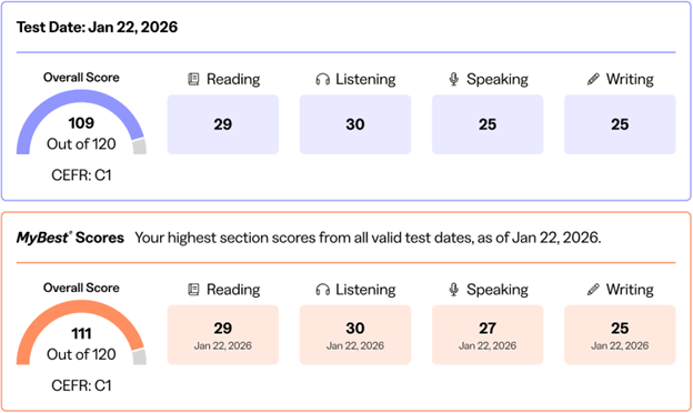 MyBest scores combine your highest section scores from all valid TOEFL iBT tests taken in the past 2 years. This can help you meet score requirements with fewer test attempts.